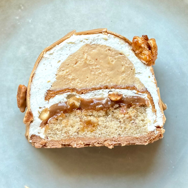 Celle-ci c'est le summum de la gourmandise ! Caramel, vanille, cacahuètes... ce sont tous ces éléments qui la composent et qui en feraient presque la bûche la plus gourmande de Toulouse ! Les textures sont variées, on y retrouve une petite note salée apportée par la cacahuète en crémeux et purée qui reste en bouche. Elle est arrondie par un caramel gourmand et croquant aux cacahuètes entières, mais aussi par la douceur d'une chantilly légère à la vanille de Madagascar. Elle est presque addictive, si gourmande !