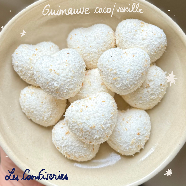 - Guimauves vanille & coco (moelleuses et riches en vanille de Madagascar, enrobées de noix de coco râpée)