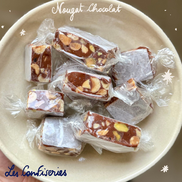 - Nougats Chocolat (au chocolat noir Valrhona et miel de fleurs, garnis de noisettes, cacahuètes et pistaches grillées)