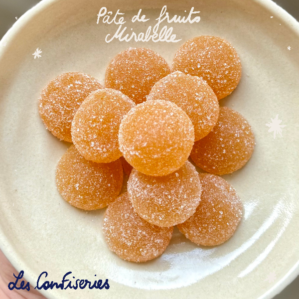 - Pâtes de fruits Mirabelle (fermes mais fondantes, moulées une à une puis enrobées de sucre à la main)